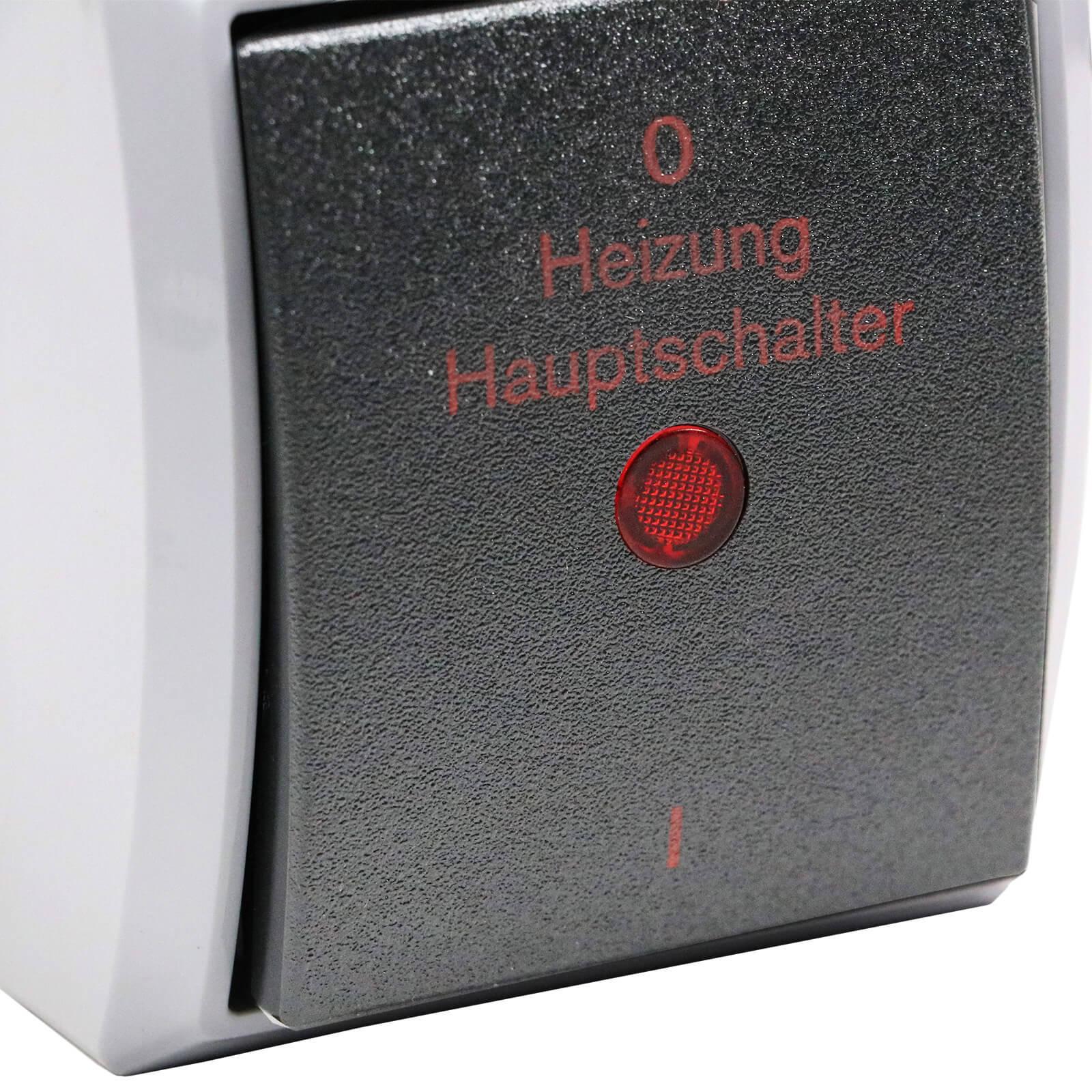 REV Ritter spritzwassergeschützter Aufputz Heizung Hauptschalter aus der Schalterserie Aquaform mit hellgrauem Rahmen und dunkelgrauem Taster. Wippe mit rotem Aufdruck Heizung Hauptschalter und roter Beleuchtung.