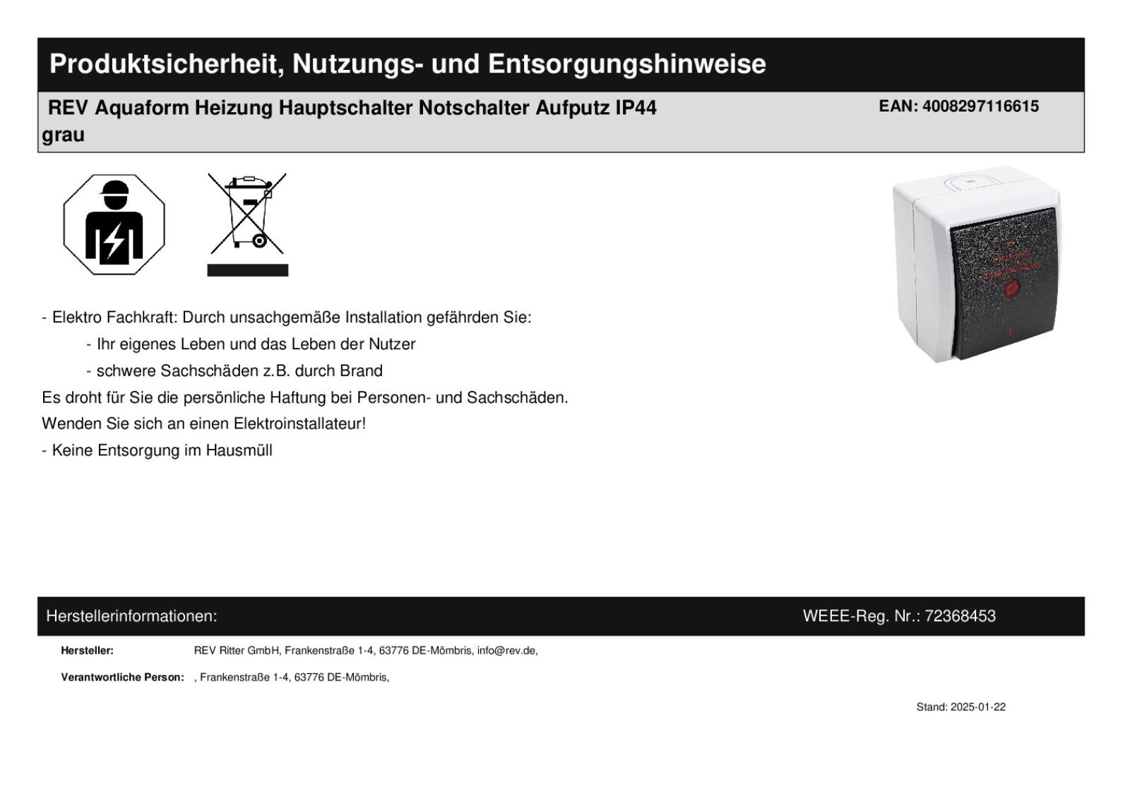 Titel | REV Aquaform Heizung Hauptschalter Notschalter Aufputz IP44 grau |