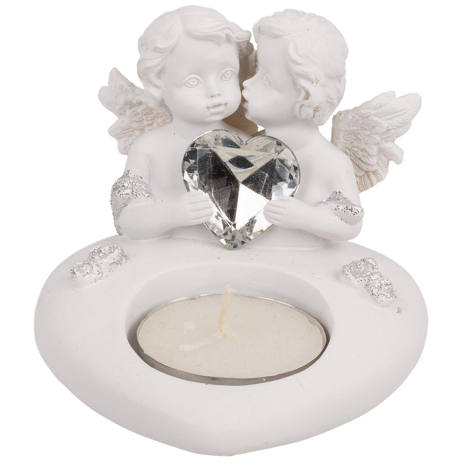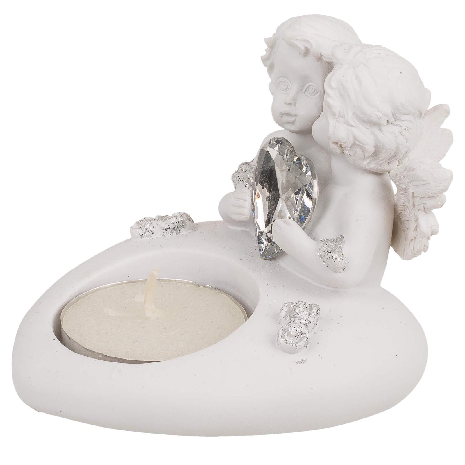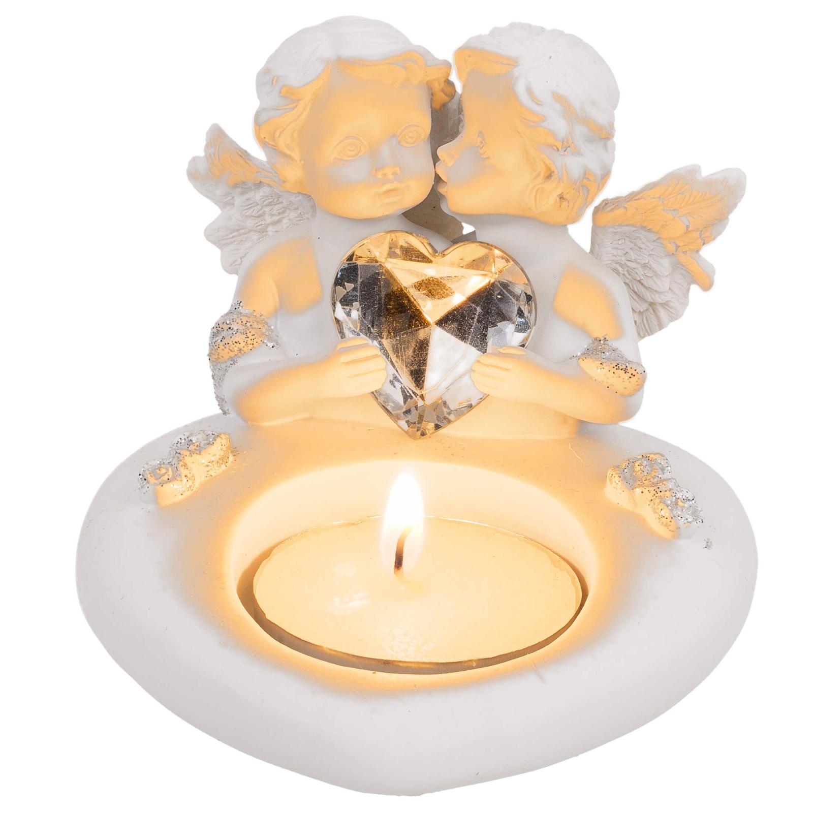 Zwei Engelfiguren halten ein funkelndes Kristallherz auf einem Teelichthalter in Herzform. Romantisch und liebevoll für eine stimmungsvolle Atmosphäre.
