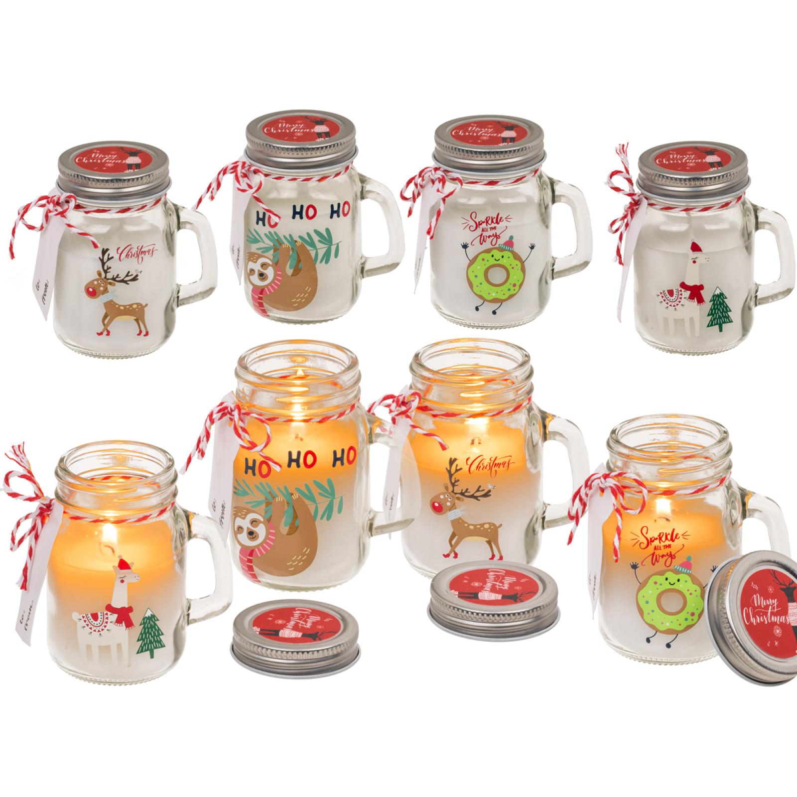 4er Set Kerzen im Glas mit Weihnachtsmotiv Faultier Rentier Lama Donut
