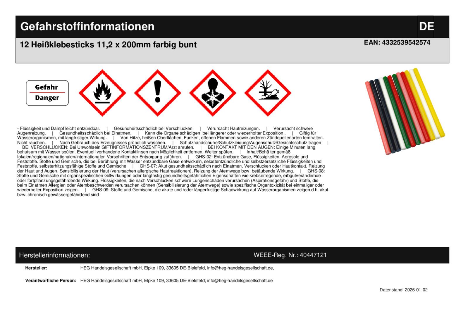 | Nutzungshinweise | Achtung! Flüssiger Kleber wird bis zu 200 Grad heiß. Bitte Hautkontakt vermeiden. Bei Hautkontakt sofort mit kaltem Wasser festigen. Dann erst von der Haut abziehen. Von Kindern und Tieren fernhalten. |