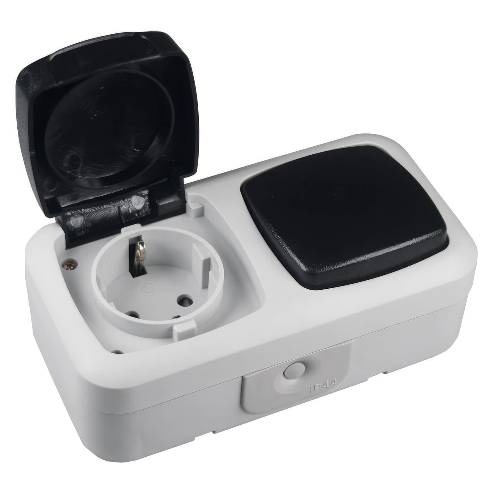 | Titel | Feuchtraum Kombination Steckdose Schalter IP44 Aufputz grau |