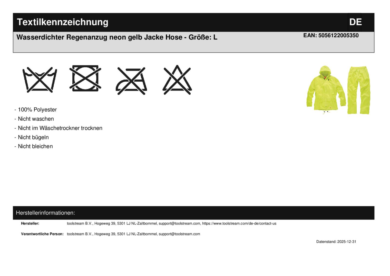 | Titel | Wasserdichter Regenanzug neon gelb Jacke Hose - Größe: L |