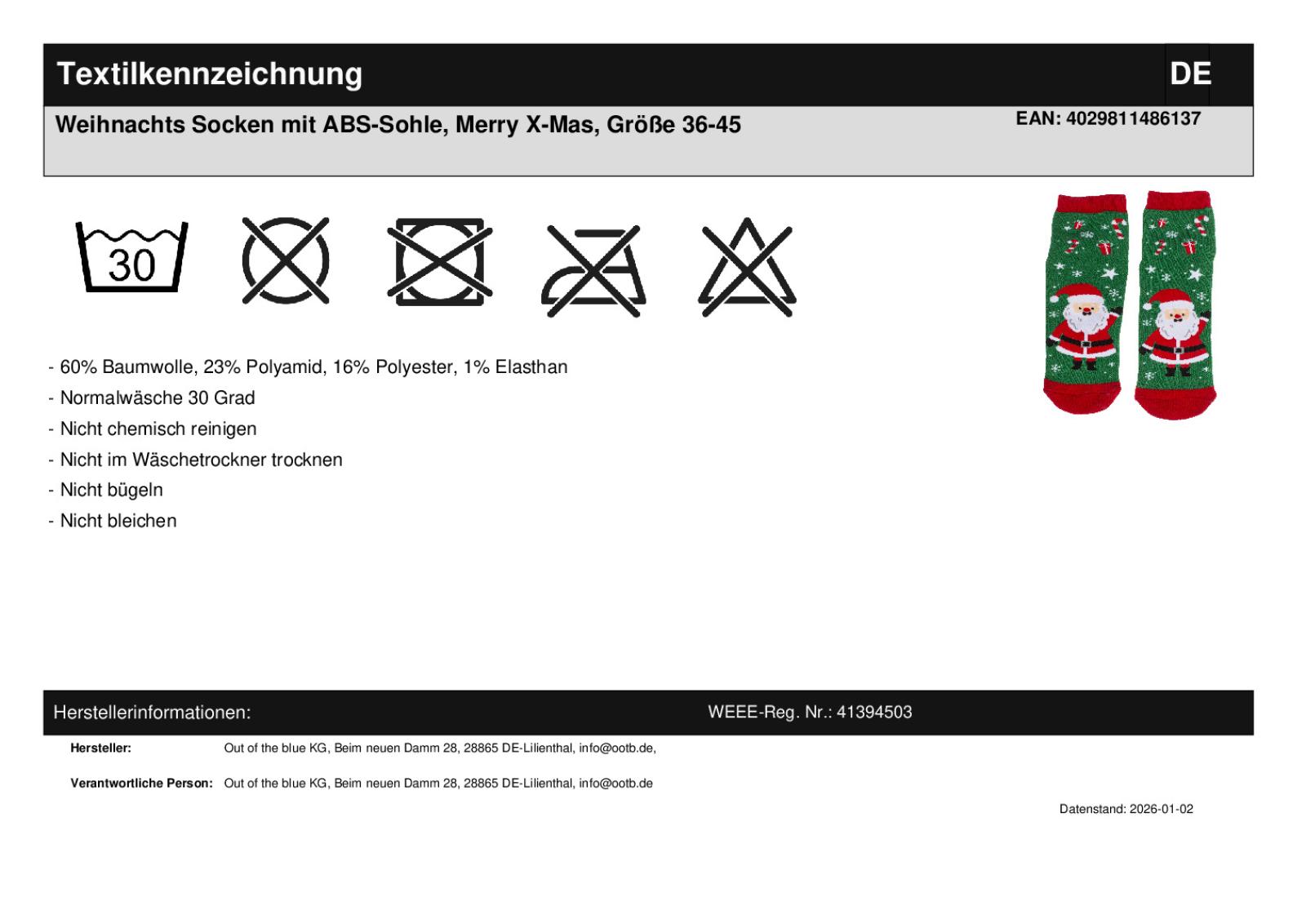 | Keywords | Anti-Rutsch, Socken, rutschfeste Sohle, Weihnachtssocken, Weihnachten, X-Mas, Socke, Einheitsgröße, 36-45, Weihnachtsmann, Nikolaus, Merry X-Mas |