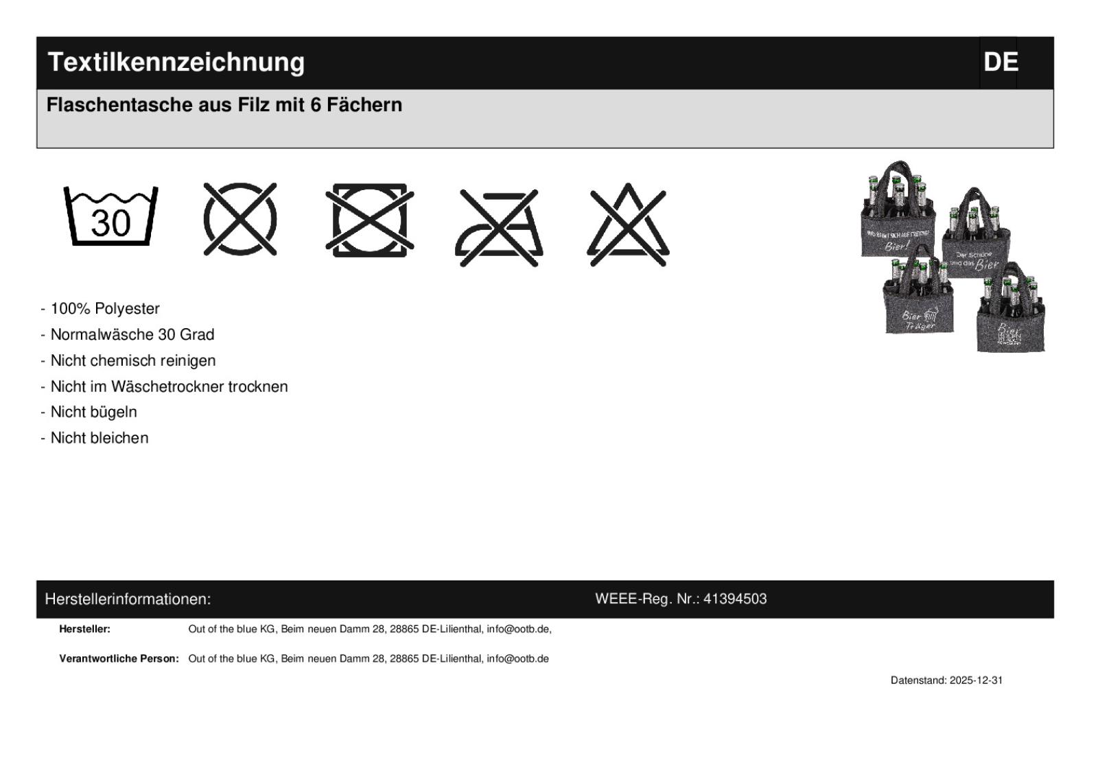 | Keywords | Getränketräger, Bierträger, Biertasche, Flaschentasche, Flaschenträger |