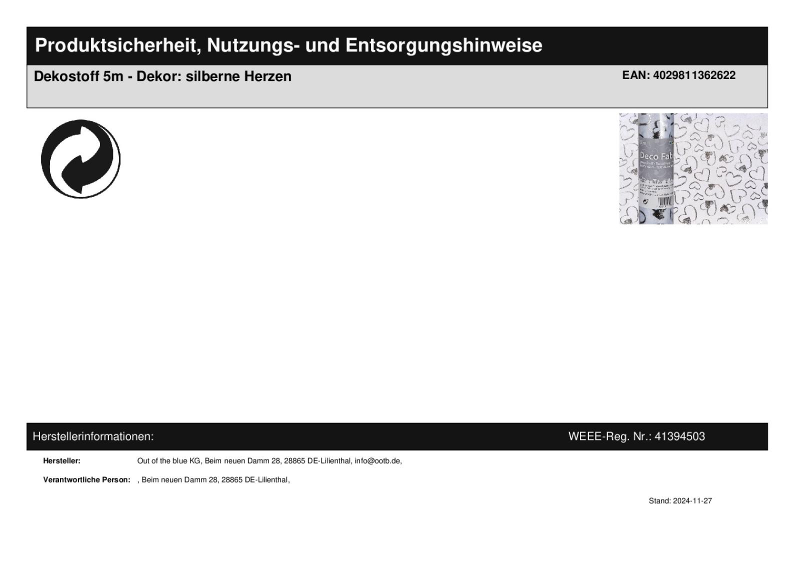 | Titel | Dekostoff 5m - Dekor: silberne Herzen |